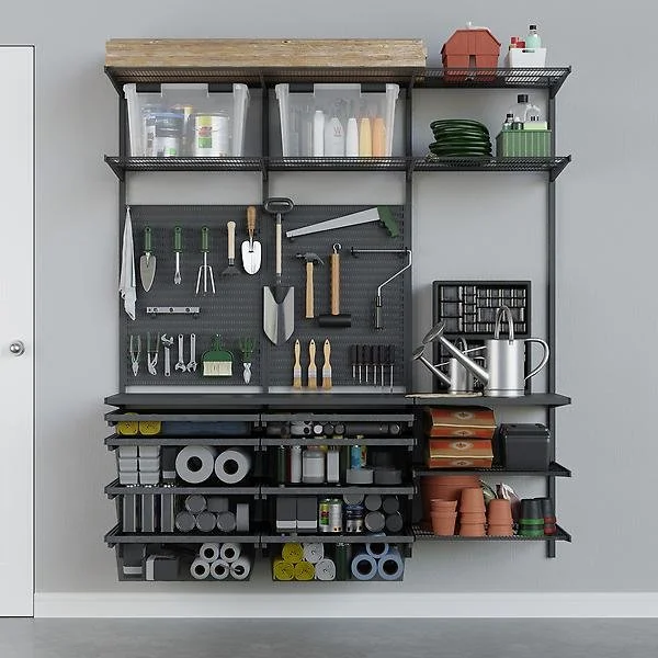 Other options outside of ELFA systems worth considering are standard wall mount shelving units to coincide with base cabinets or shelves. Pegboards have been a tried and true favorite of many garage organization projects.